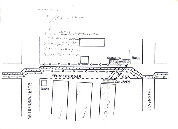 Heidelberger Straße zwischen Elsen- und Wildenbruchstraße, der ungefähre Tunnelverlauf ist markiert. Skizze eines Westberliner Polizisten des zuständigen Polizeireviers in der Wildenbruchstraße. Quelle: Mann, 2005, Tunnelfluchten. Transit Buchverlag. Berlin. S.112.