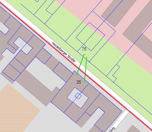 Heidelberger Straße zwischen Elsenstraße und Sinsheimer Weg. Beide Tunnel zum gegenüberliegenden Haus Nr. 75 sind markiert, der Mauerverlauf rot eingetragen.