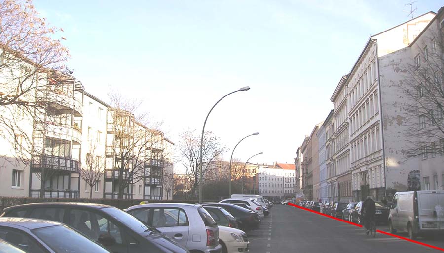 Links die Sebastianstraße im Jahr 2012 von der Heirich-Heine-Straße aus gesehen. Die Gebäude sind zwar größtenteils modernisiert, sonst aber unverändert. Der Mauerverlauf ist rot markiert. Das Bild lässt sich durch Anklicken vergrößern.